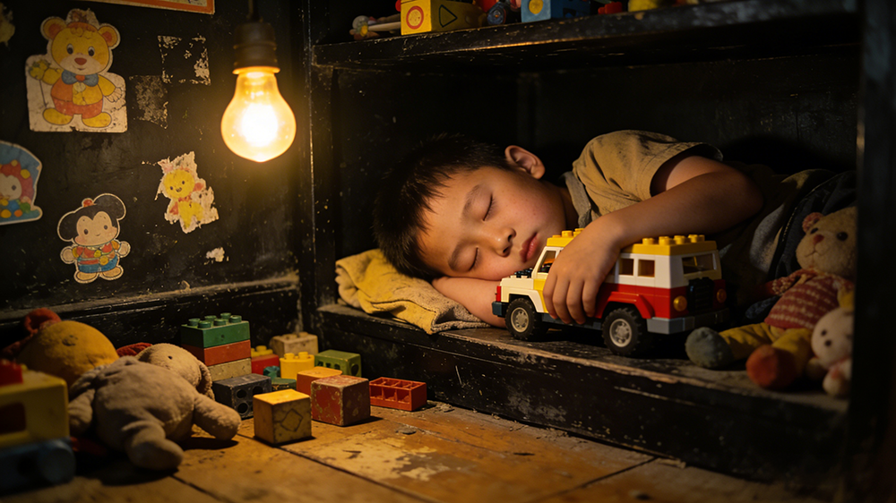 当我哭累的时候,眼泪也流干了。我摸到了一个箱子,先是在箱子上坐了一会儿,这时发现手边有个小汽车,便来回推了推,逐渐困意袭来,我再也支撑不住,手里攥着小汽车就睡着了。